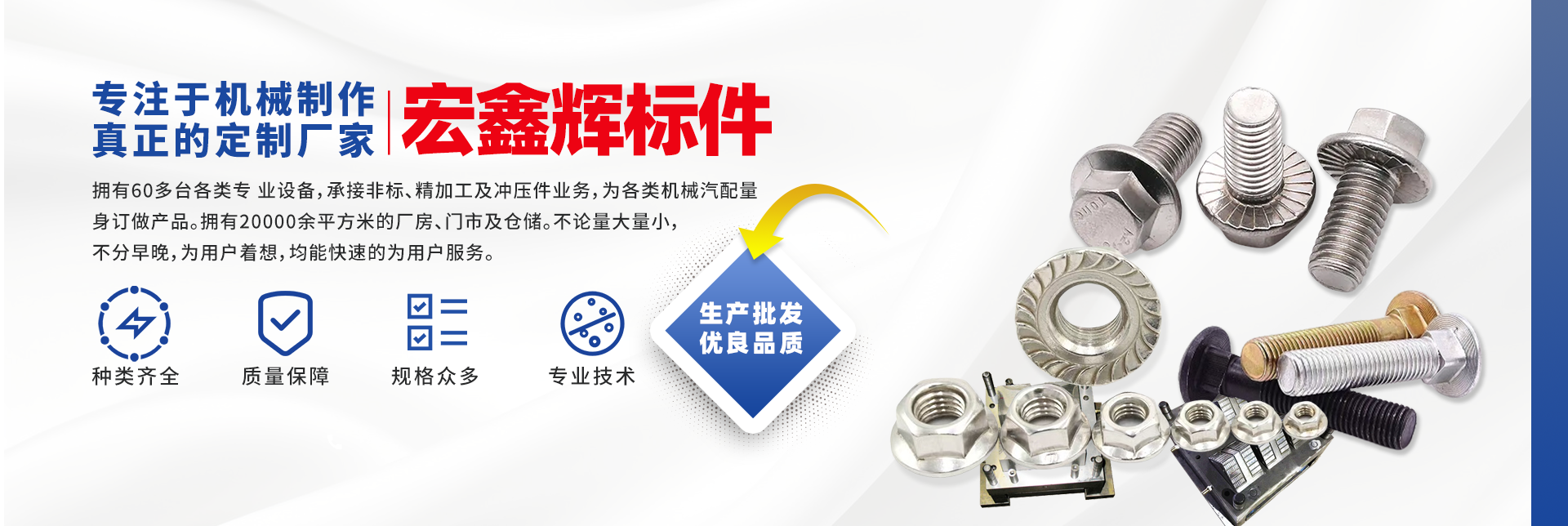 四川宏鑫輝標(biāo)準(zhǔn)件制造有限公司下設(shè):南充市宏輝機械制造有限公司,南充市聚宏機電設(shè)備有限公司,公司始建于1994年。為了拓展市場,降低成本,本公司于2007年、2020年分別在南充、 成都、重慶創(chuàng)建了生產(chǎn)基地。擁有60多臺各類專 業(yè)設(shè)備,承接非標(biāo)、精加工及沖壓件業(yè)務(wù),為各 類機械汽配量身訂做產(chǎn)品。擁有20000余平方米的廠房、門市及倉儲。公司以誠信為本,竭誠為廣大客戶提供服務(wù)。不論量大量小,不分早晚,為用戶著想,均能快速的為用戶服務(wù)。 公司所生產(chǎn)及代理的產(chǎn)品為業(yè)界人士公認(rèn)的國內(nèi)、國際優(yōu)等品牌。在產(chǎn)品性能與質(zhì)量